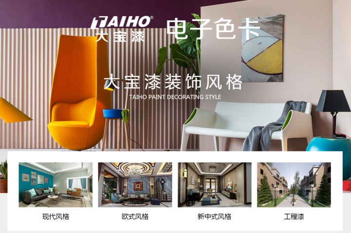 大寶漆在線配色電子色卡體驗系統(tǒng),主頁風格模塊包括現(xiàn)代風格、歐式風格、新中式風格、工程漆,在這里你可以根據(jù)居家戶型、裝修風格、個人喜好選擇色彩、產(chǎn)品,隨心組合搭配,就能立即看見“實裝效果”,全方位滿足消費者不同程度的色彩和涂裝服務需求。
